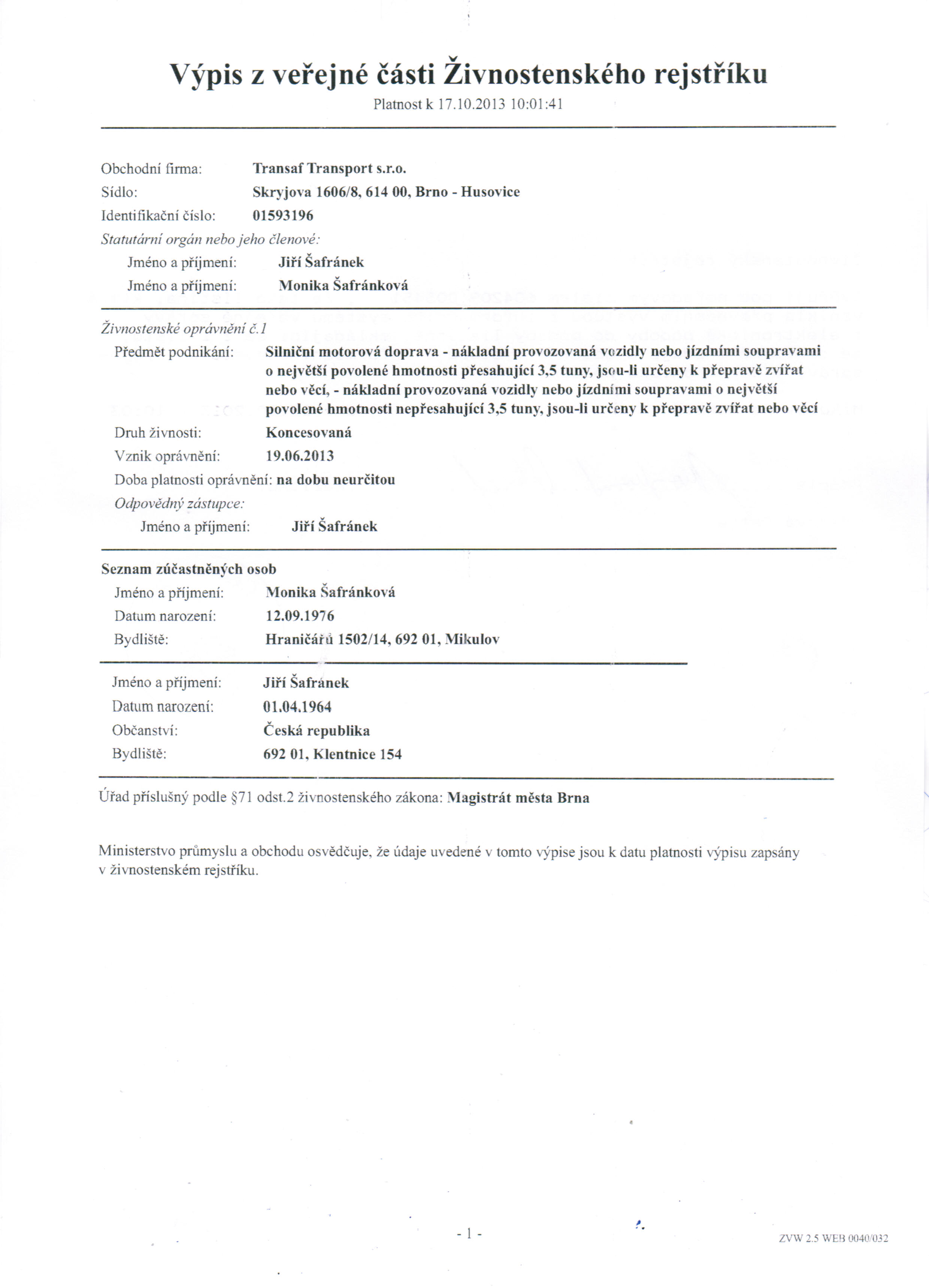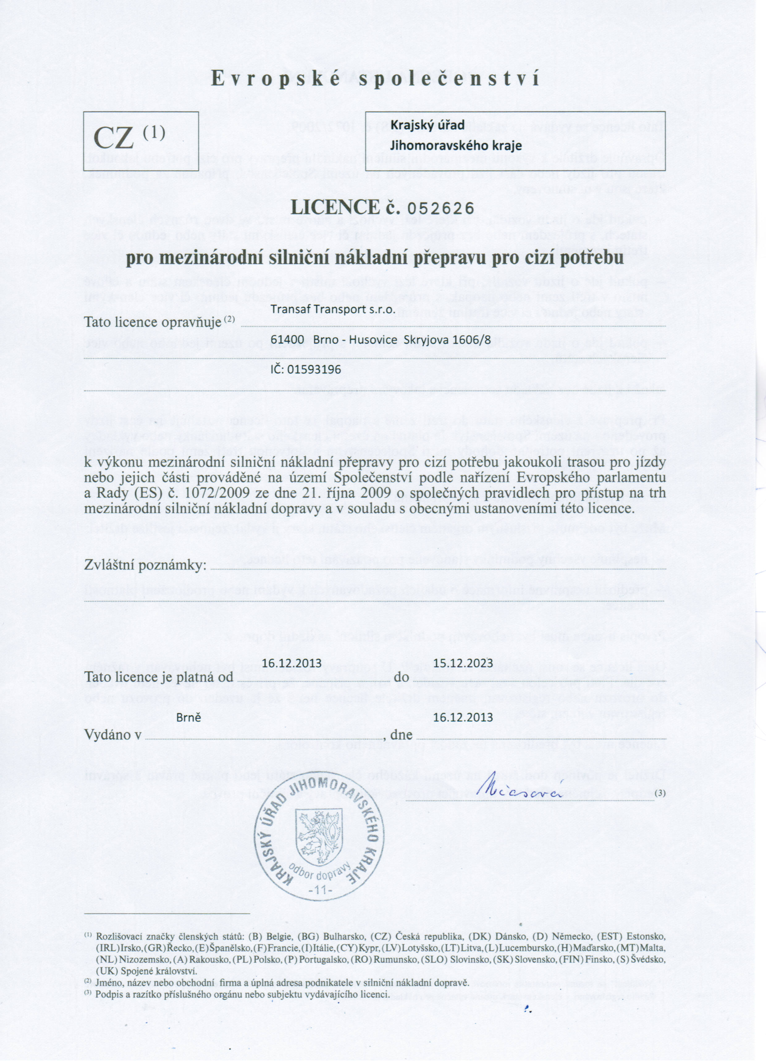 Naše firma je řádně zaregistrovaná a splňuje veškeré zákonem stanovené podmínky potřebné k provozování autodopravy.